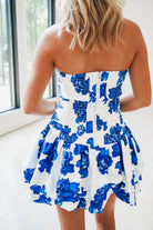 Elevate your style with the Maverick Mini Dress, featuring a strapless, sleeveless design that highlights your shoulders and arms. The ruched, pleated bodice offers a flattering fit, while the dramatic ruffle skirt adds playful movement. Adorned with a charming blue and white floral print, this dress is perfect for making a memorable impression at any event.