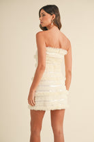 Elevate your style with the cream Meghan Dress! Featuring stunning sequins and a pleated ruffle design, this tube mini dress is sure to turn heads. Step out in confidence and make a statement at any event.