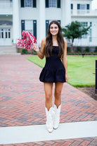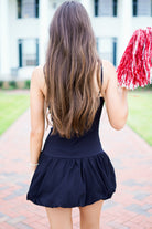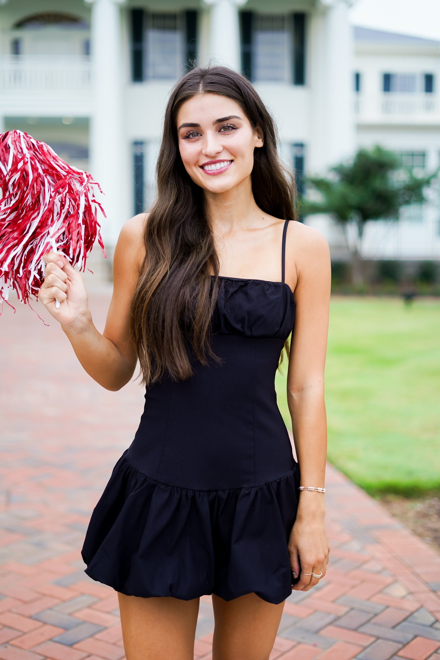 Introducing the Meryl Dress: a playful, black mini dress with a straight square neckline and adjustable thin straps. The ruched bodice adds a fun touch, while the bubble hem creates a unique look. A must-have for any fashion-forward individual!