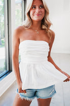 Turn heads with our Morrone Top! This playful tube top features a bubble peplum and pleated bodice for a fun and flirty style. The smocked back panel ensures a comfortable and secure fit. Perfect for any occasion!