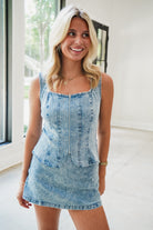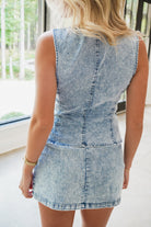 Get ready to turn heads in the Nella Mini Dress! This playful denim blue dress features a sleeveless design with a round neckline and a front metal zipper closure. Lift up the bodice to reveal a fun, attached mini skirt underneath—perfect for showing off your style with a cheeky twist. Ideal for days when you want to mix casual cool with a flirty edge.
