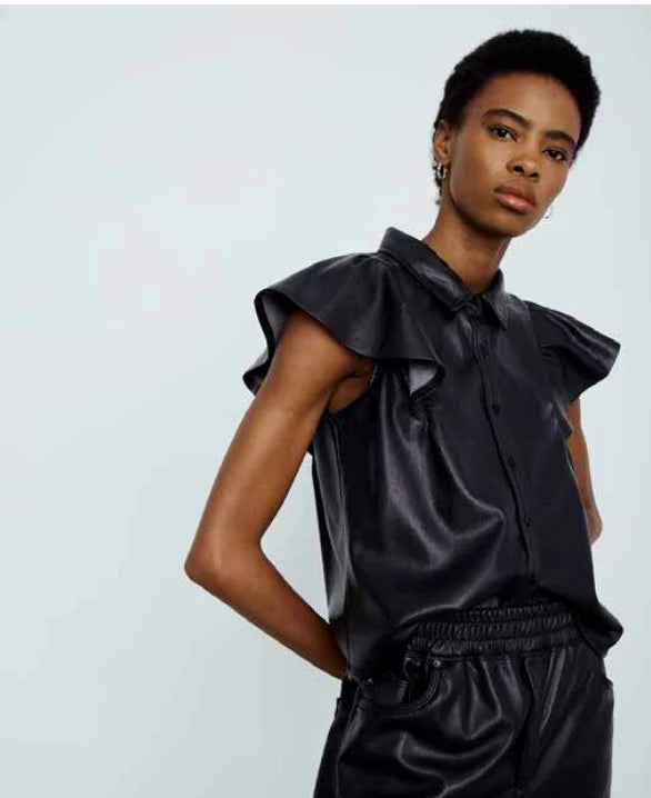 Shake up your wardrobe with the MELISSA NEPTON Nessah top. Made from faux leather, this black top features a playful flutter ruffle and full front button closure. Perfect for adding a touch of edginess to any outfit. (Final sale, so don't wait to add it to your collection!)