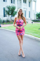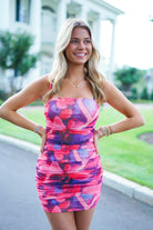 Discover the bold and vibrant Oslo Dress! Featuring a stunning abstract print and ruched tank design, this mini dress will turn heads and make you stand out in any crowd. Made with comfortable, bodycon material, this dress will highlight your curves and make you feel confident and fierce. Elevate your style with the Oslo Dress.
