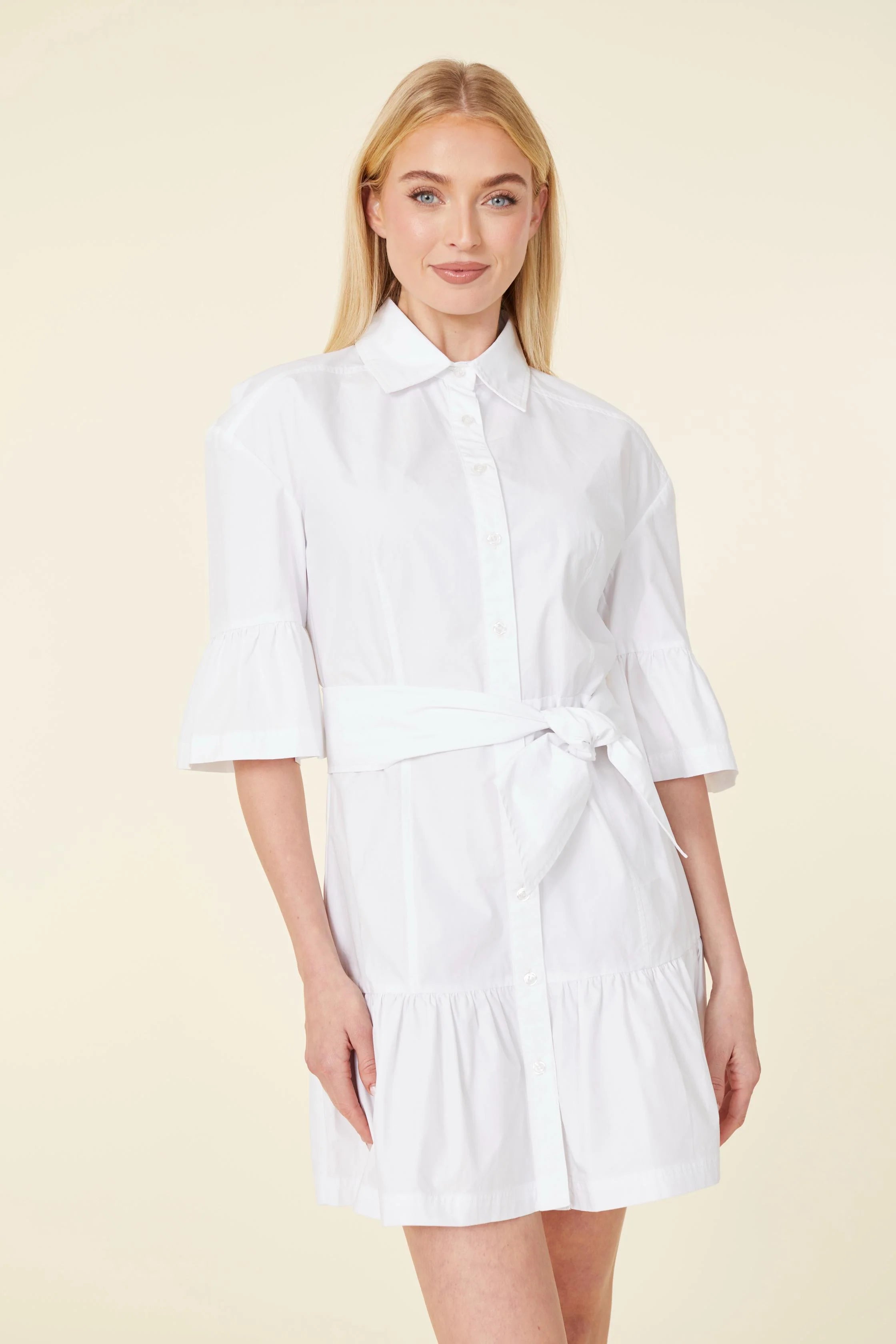 Our Poplin Ruffle Detail Dress is a versatile piece that can be worn with or without the sash for different looks. Made from high-quality poplin fabric, this dress is lightweight and breathable, perfect for warm weather. The ruffle detailing adds a feminine touch, while the removable belt allows you to cinch your waist for a flattering silhouette. This dress features a shirt collar, button-up front, and three-quarter sleeves for a classic look. Dress it up or keep it casual with sandals for a chic ensemble.