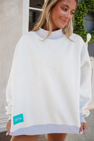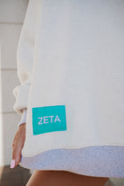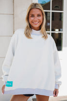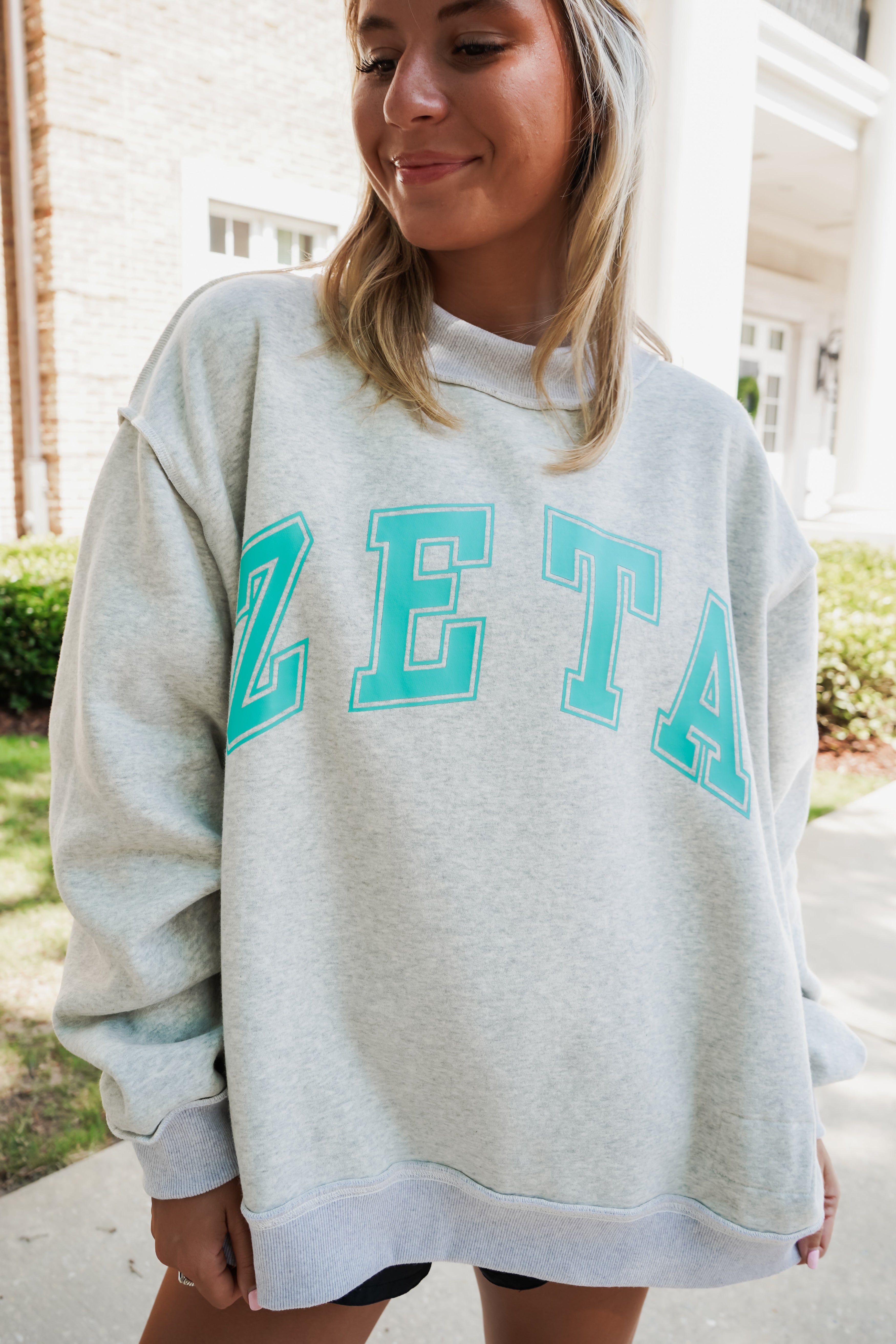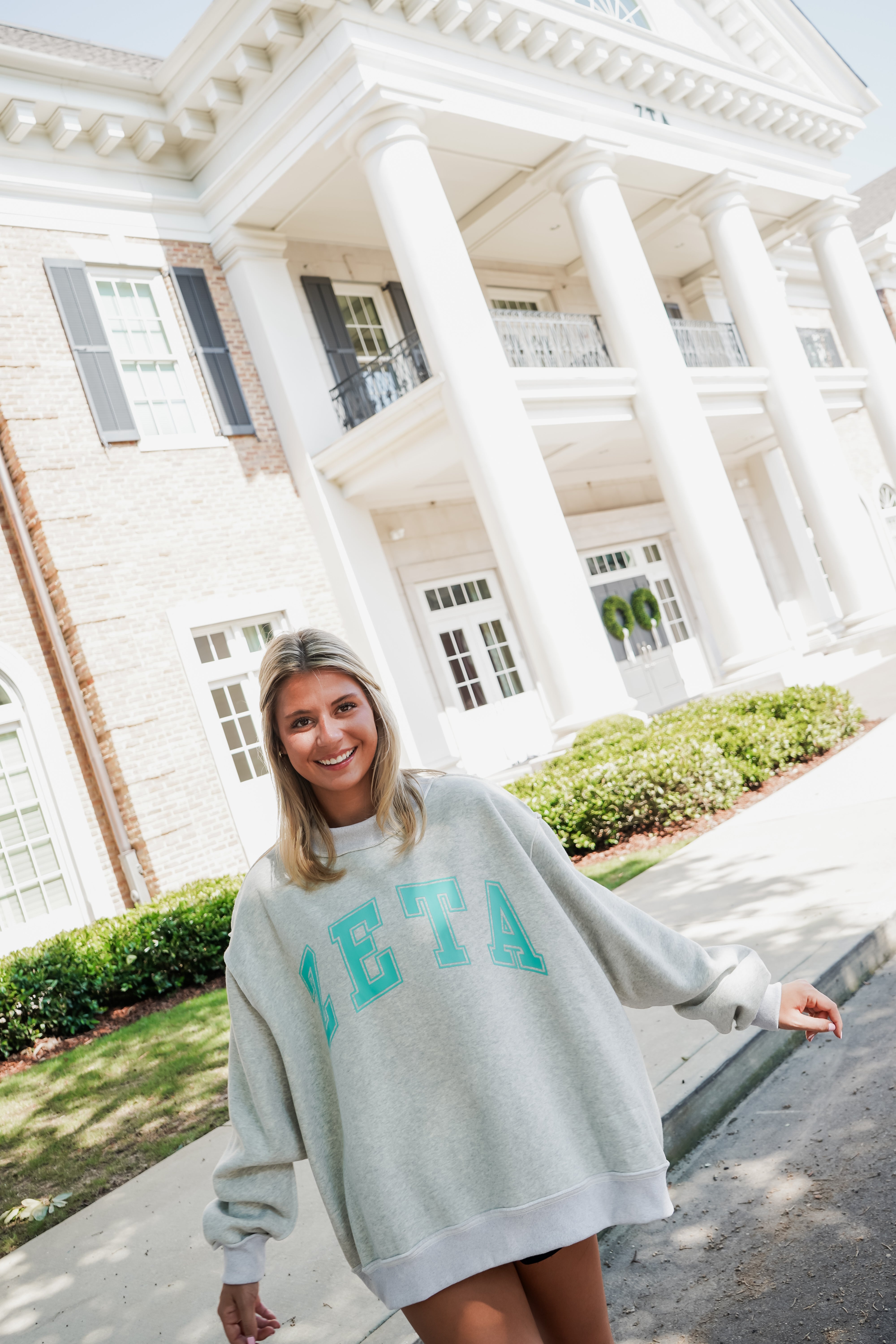 Stay cozy and stylish with this heather grey oversized mock neck sweatshirt, featuring a bold varsity block print on the front in classic sorority colors! Designed for reversible wear, flip it inside out to reveal a sleek contrast rectangle woven patch label for a fresh look. Perfect for showing off your greek pride with a playful twist!