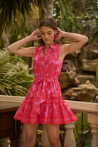 Feel the romance with the Rency Floral Zady Mini Dress in vibrant fuchsia and red! This playful sleeveless dress features a chic collared neck, button-up front, and a waist-cinching belt. Finished with a flirty ruffle hem, it’s perfect paired with a sun hat, mini bag, and flat sandals for an effortlessly beachy vibe.