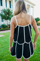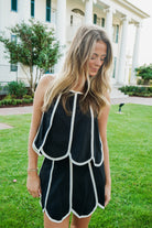 Step out in style with the Rhett Set, a playful two-piece featuring a sleek black fabric accented by crisp white piping. The sleeveless top with a straight neckline pairs perfectly with a petal-shaped skirt, both finished with a charming scalloped hem for a flirty touch. Easy to mix and match, this set brings fun and sophistication to your wardrobe.