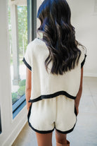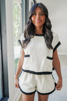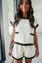 Elevate your casual style with the Rhodes Set, featuring a cream tweed textured crop top with playful contrast frayed black hems and handy front pockets. Paired with matching boxy shorts, this set offers an elastic waistband and drawstring tie for a comfy, adjustable fit. Perfect for sunny days when you want to look effortlessly chic and feel cool.