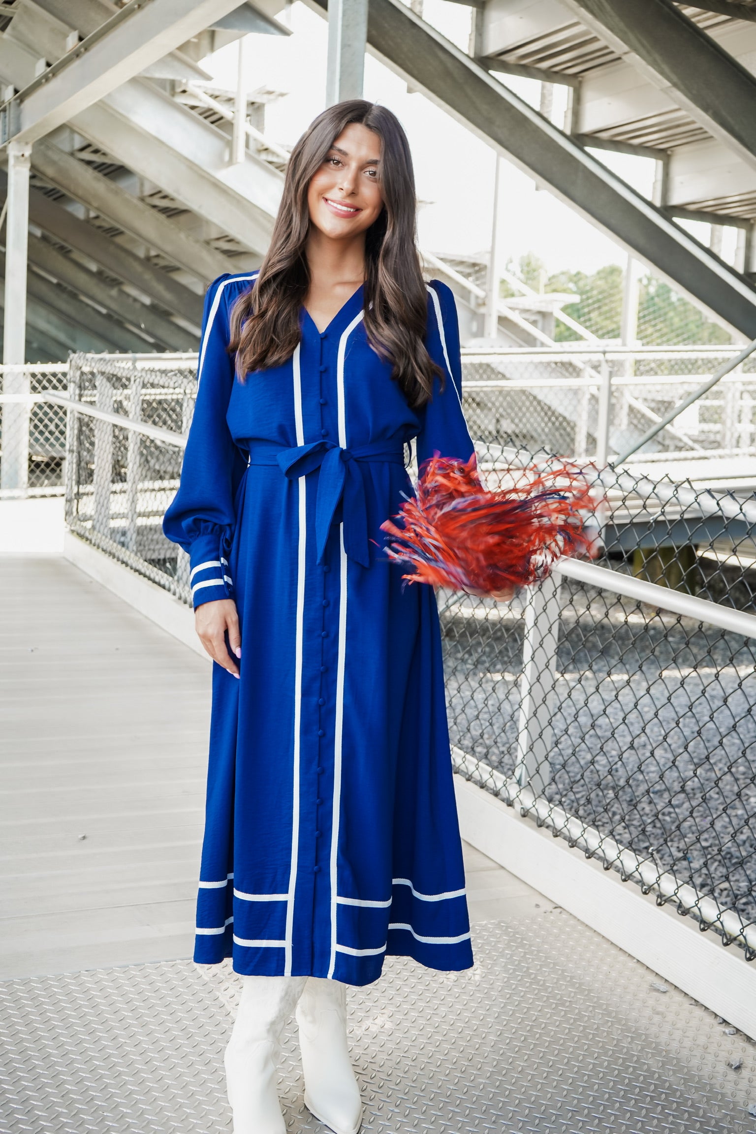 Step out in style with the Riley Midi Dress, featuring navy blue long cuffed sleeves and a flirty low v-neckline. The loop button front closure adds a charming touch, while the belted waistline highlights your silhouette perfectly. Finished with crisp white trim details, this dress brings a playful twist to classic elegance. Perfect for any occasion where you want to feel confident and effortlessly chic.