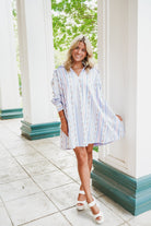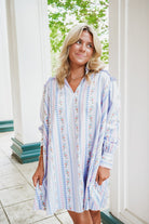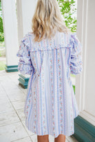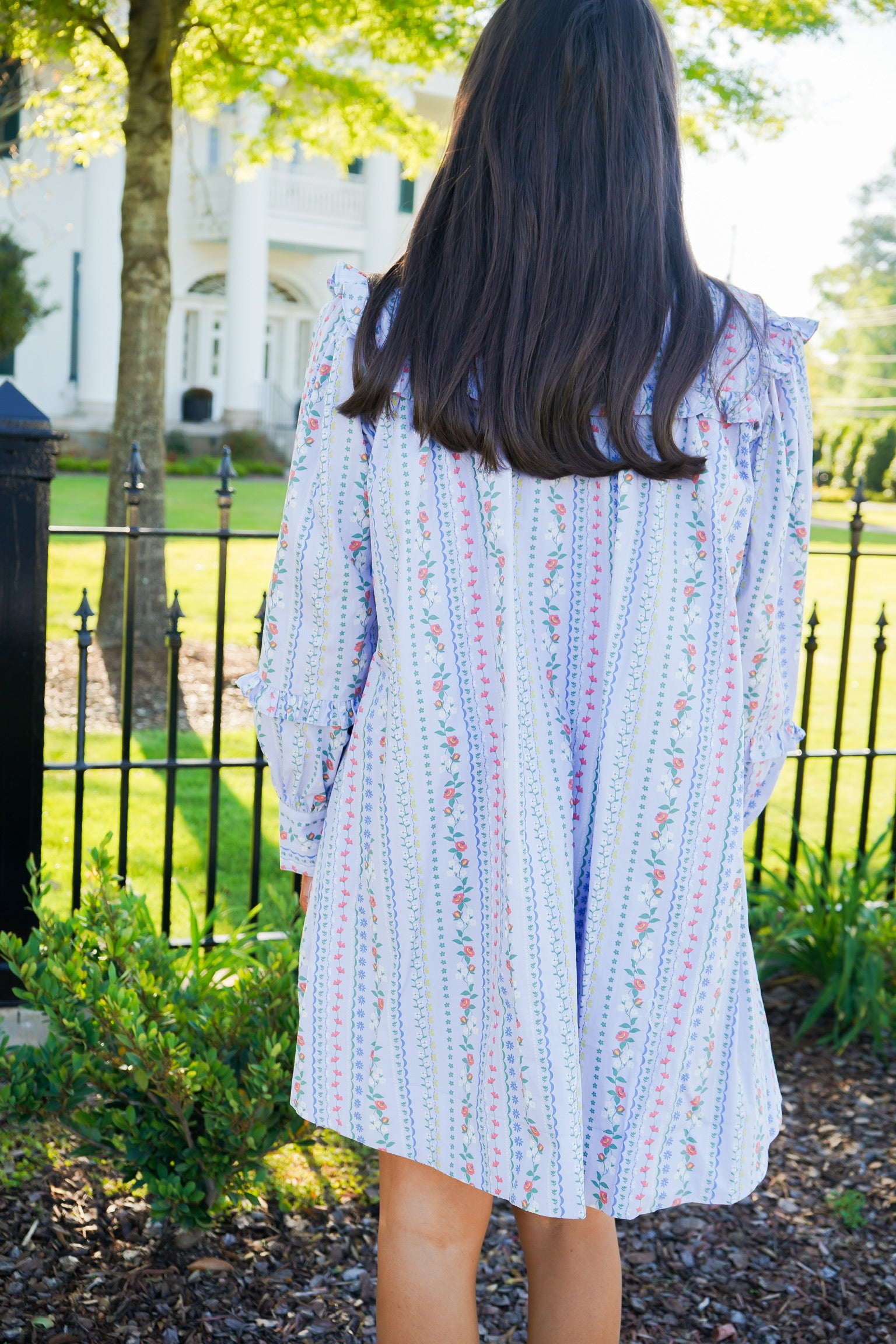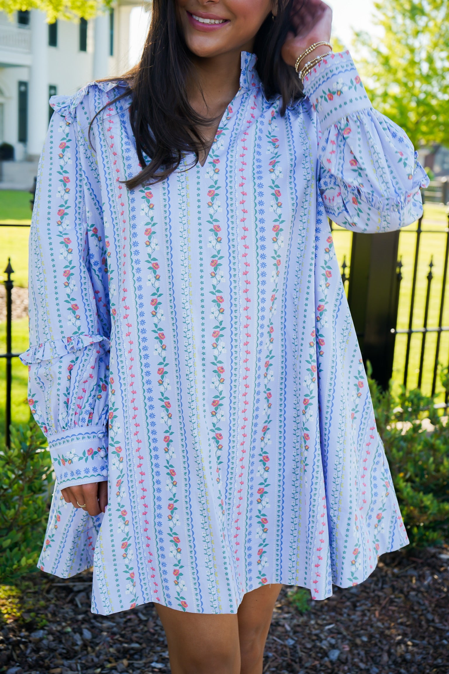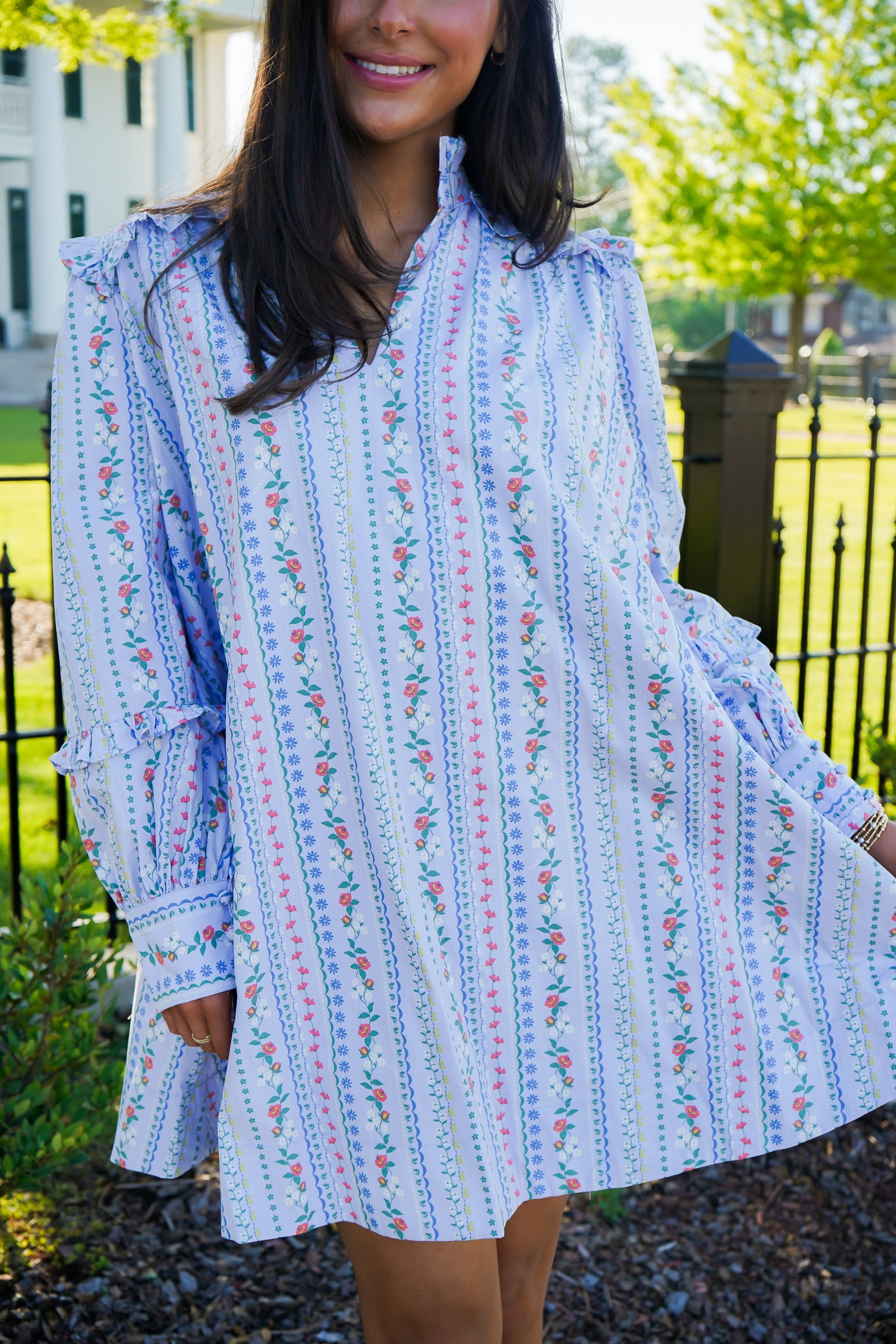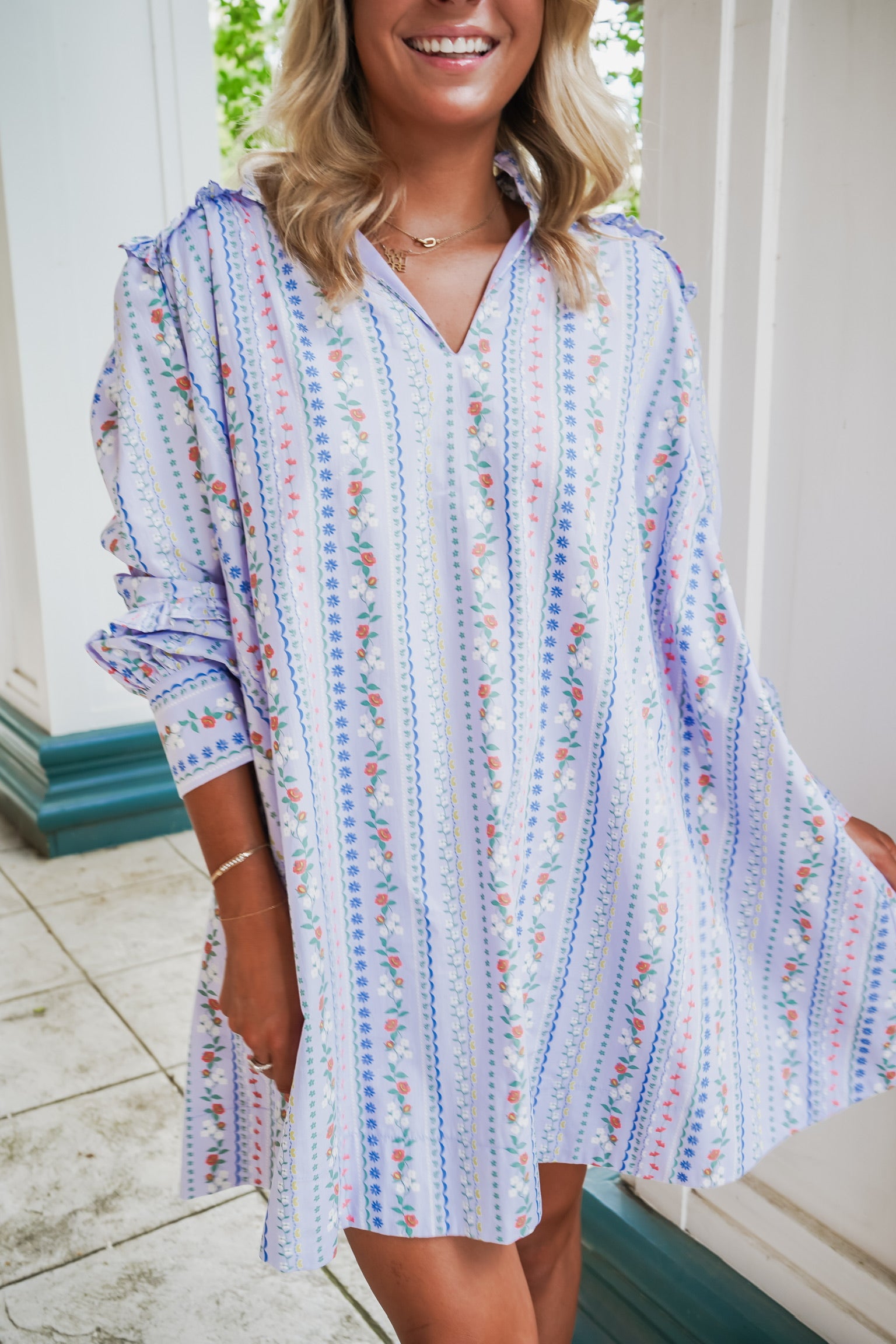 Get ready to feel whimsical in our Romance Mini Dress! This periwinkle floral vine printed dress features a flattering v-neckline, playful ruffle details, and flowy long sleeves. Perfect for a flirty and feminine look.