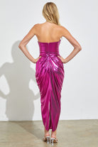 Step into the spotlight with the Rorie Midi Dress in vibrant berry purple metallic. Its sleeveless, strapless design combined with a corset-structured bodice beautifully shapes your silhouette, while elegant drape details add a touch of whimsy. The daring high side slit keeps your look playful and flirty, perfect for turning heads at any event. Embrace fun, flair, and a little sparkle all in one stunning dress.