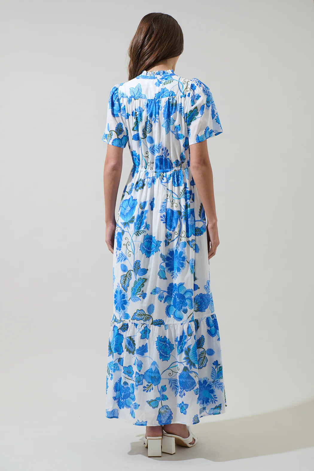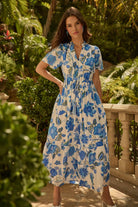 Charming and effortless, our Samian Floral Kissa Button Down Maxi Dress is the perfect addition to your warm-weather wardrobe. A split neckline framed by short sleeves tops a flowy midi skirt that's separated by a drawstring waist. Ruffle details sweep across the bottom third of the skirt to create a single tier. Wear it heels to go along.