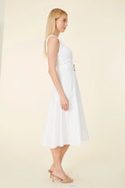 Stay cool and stylish in our Sleeveless Midi Dress, featuring a ribbed knit top and a cotton blend bottom. The attached belt with a tortoiseshell buckle cinches the waist for a flattering silhouette. This versatile dress is perfect for any occasion, from a casual day out to a special event. The midi-length skirt is flattering on all body types, making it a must-have wardrobe staple. Dress it up with heels or keep it casual with sandals - this dress combines comfort and style effortlessly.