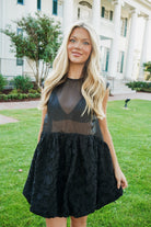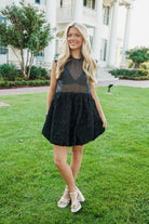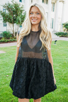 This playful Stella Mini Dress features a sleeveless, see-through organza bodice with delicate mesh detailing, enhanced by charming flower-textured appliques. The bubble skirt hem adds a flirty touch, while the included bralette ensures comfort and coverage. Perfect for turning heads with a fun and feminine vibe.