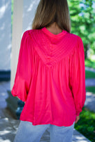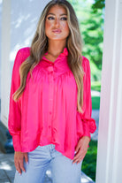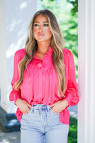 Our Sydney Pleat Top is the perfect blend of style and comfort! With its striking magenta pink color and front button closure, you'll make a statement wherever you go. The cuffed sleeves and pleated bodice detail add a touch of elegance to this long sleeve top. Feel confident and stylish in this must-have addition to your wardrobe!