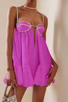 Get ready to turn heads in Thea Mini Dress! The rhinestone embellished bustier adds a touch of glamour to this flirty fuchsia mini dress. With thin straps and a v-neckline, this dress is perfect for a night out. (Last call: FINAL SALE!)