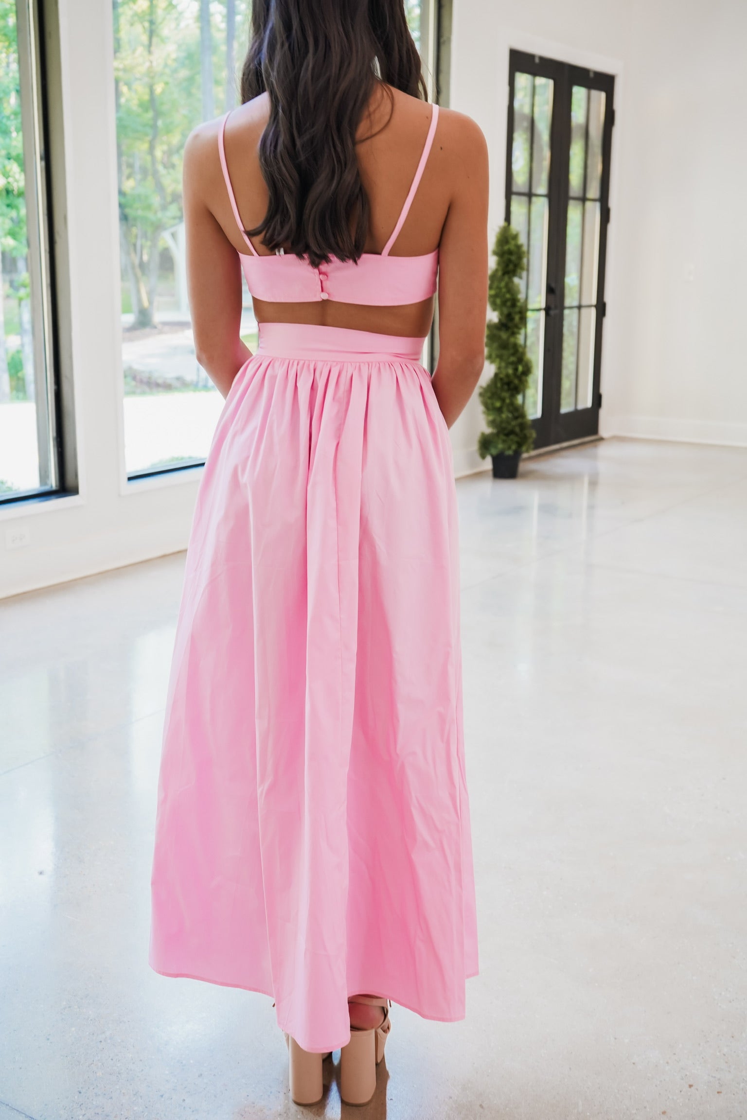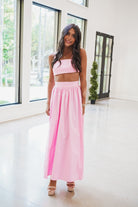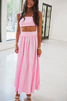 Get ready to turn heads in the Tova Set! This playful baby pink two-piece features a fitted crop top with a straight neckline and a flowing maxi skirt with handy side pockets. Perfect for sunny days or casual nights out, it combines comfort with a flirty, fun vibe.