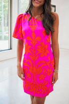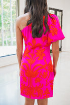 Turn heads in the Vallie Mini Dress, a playful blend of magenta pink and vibrant orange floral accents. Featuring a chic one-shoulder puff sleeve and a flattering shift silhouette, this dress brings fun and flair to any occasion. Perfect for dancing the night away or making a bold statement at your next event.