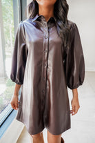 Our Faux Leather Dress with Puff Sleeves is your ticket to classic sophistication with a touch of edgy casual. Made from lightweight vegan leather, this tunic features three-quarter puff sleeves, a button-up front, and a classic collar. Paired with tights and a lightweight cardigan or jacket, this faux leather dress is ideal for the fall season, offering some warmth as well as a stylish, edgy appeal. Get ready to make a fashion statement with this comfortable and unique piece.