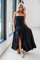 Slip into the Ventura Maxi Dress in classic black for instant glamour! This strapless stunner features a figure-hugging ruched bodice that transitions into a playful bubble maxi skirt. With its flirty front leg slit and convenient back zipper, you'll turn heads while dancing the night away. Perfect for making an entrance at your next special occasion!