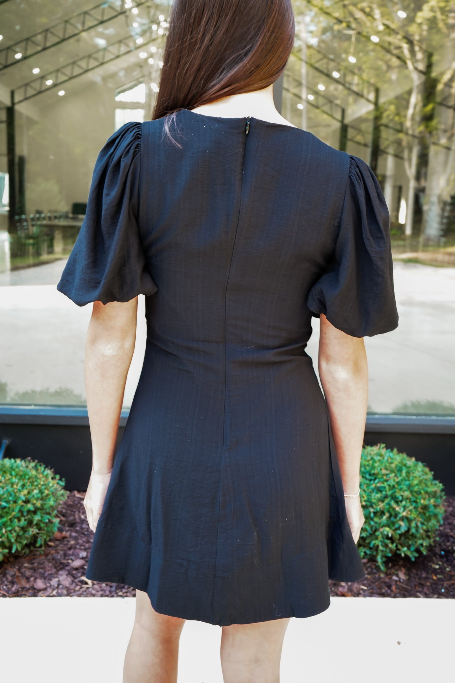 This playful Virginia Mini Dress in rich black features puffed short sleeves and a flattering fitted silhouette that flows with every step. The romantic V-neckline and charming front textured seam add a touch of delicate detail, making it perfect for fun days and flirty nights. Embrace effortless style with this mini dress that combines comfort and whimsy in one chic package.