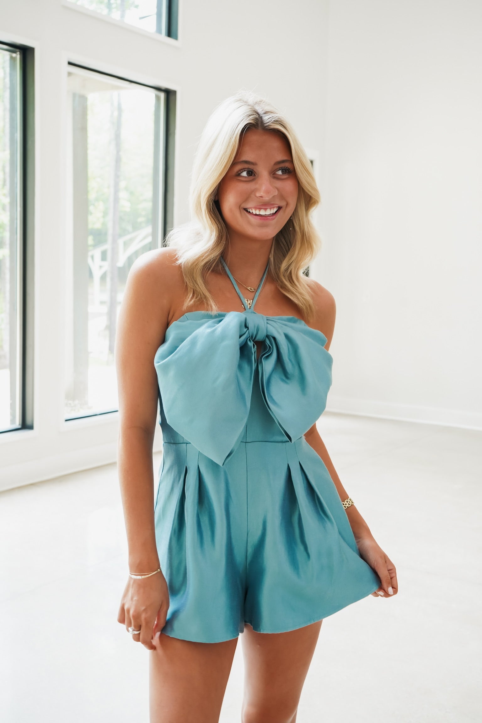 Lana Satin Bow Romper - Blue - FINAL SALE