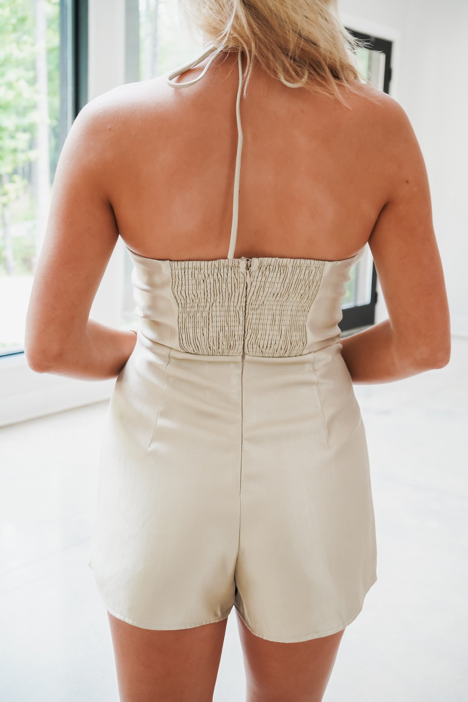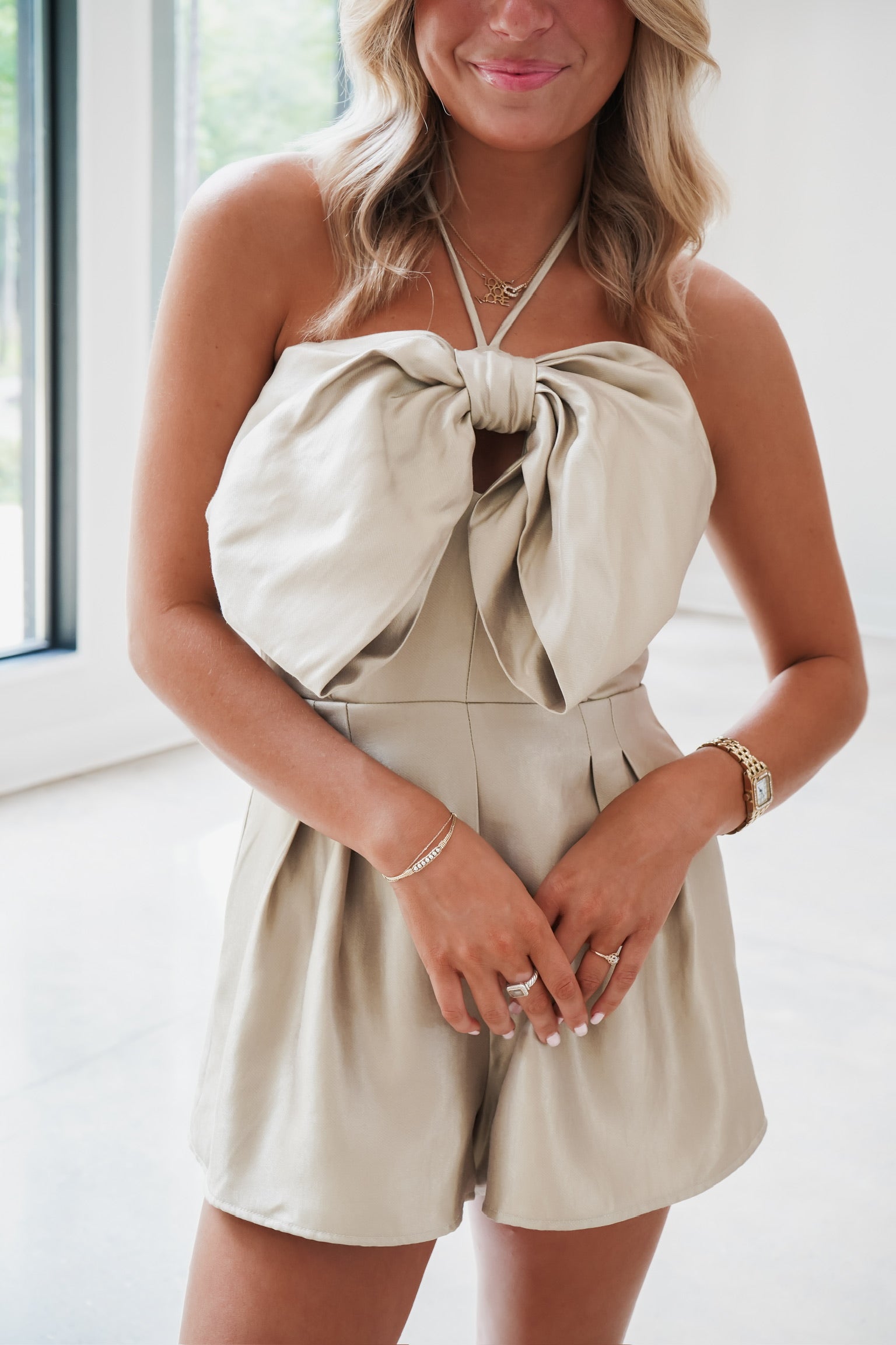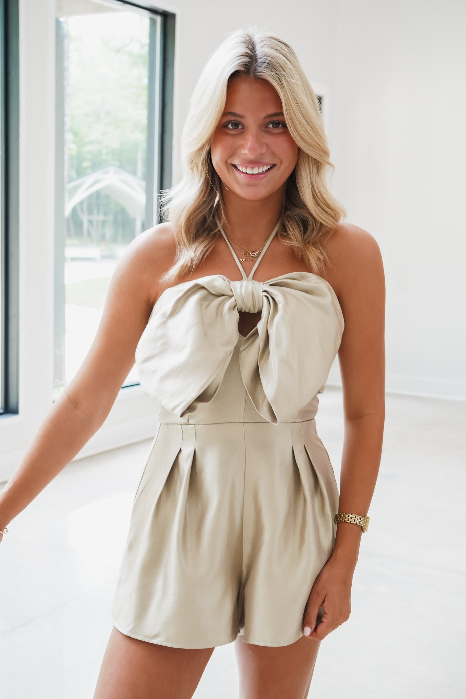 Lana Satin Bow Romper - Beige - FINAL SALE
