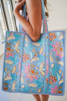 Carry your essentials in style with this stunning quilted tote bag crafted from 100% cotton! The exterior showcases an eye-catching floral print in vibrant hues, while the interior features a contrasting stripe pattern paired with a matching floral printed side pouch—perfect for organizing smaller items. Reinforced long straps make it comfortable for everyday wear, whether you're heading to the market, beach, or office. The open design offers easy access without the fuss of zippers, giving you a versatile bag that combines practicality with undeniable charm.