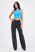 The A Carrie Jean in Teri wash is a super high rise, relaxed leg jean, made with non-stretch rigid denim.
