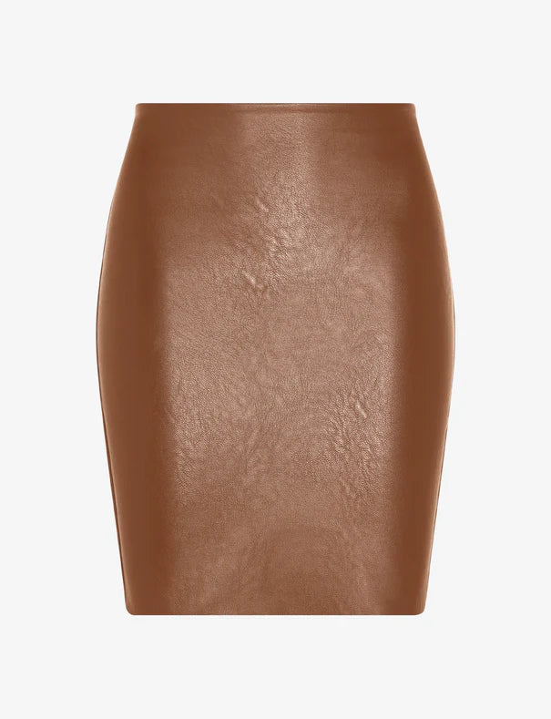 The Faux Leather Mini Skirt is made from Commando's fan-favorite faux leather. With four-way stretch, raw-cut edges and built-in smoothing shorts, this faux leather mini skirt is comfortable, chic, and fabulously flattering. This skirt may feel snug when you first pull it on, but it will form to your shape within first wear. Trust us—it's worth the wiggle!