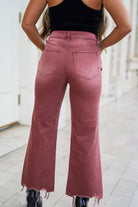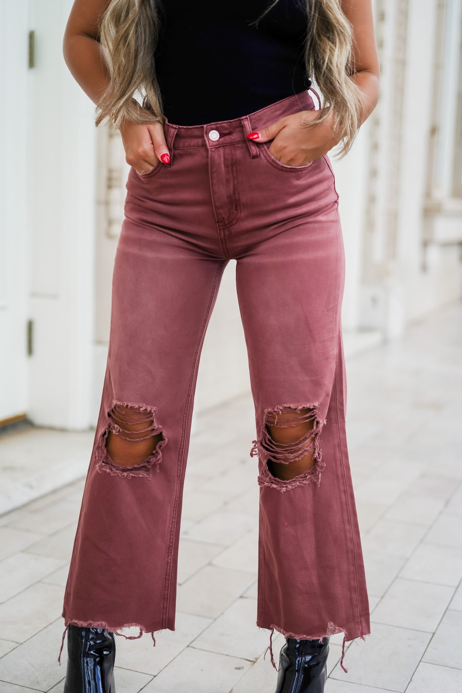 Transition into the fall season with South denim! These vintage russet brown jeans feature a distressed, oversized knee hole, raw hem, cropped flare fit, and has no stretch! These are high waisted and such a trending look!