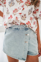 Crafted from lightweight denim, the Nina Mini Skort combines style with practicality. This wrap-front design features a buttoned closure, functional belt loops, and generous pockets—essential details for everyday wear. The skort silhouette offers the polished look of a skirt with the comfort and coverage of shorts, making it a versatile wardrobe staple for any season.