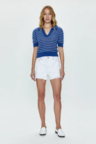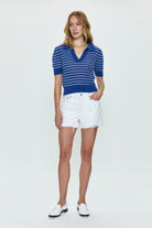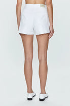 High-rise denim short with a relaxed silhouette, in a medium length crafted from rigid non-stretch denim to hold its shape. Offered in clean white colored denim, accented by contrast hardware and medium distressing notes throughout.
