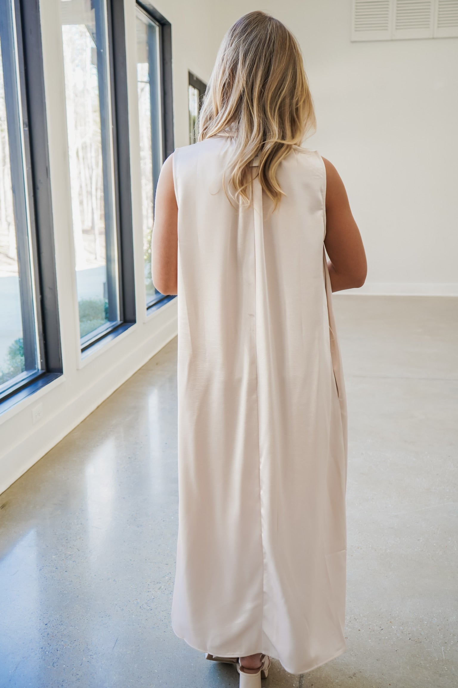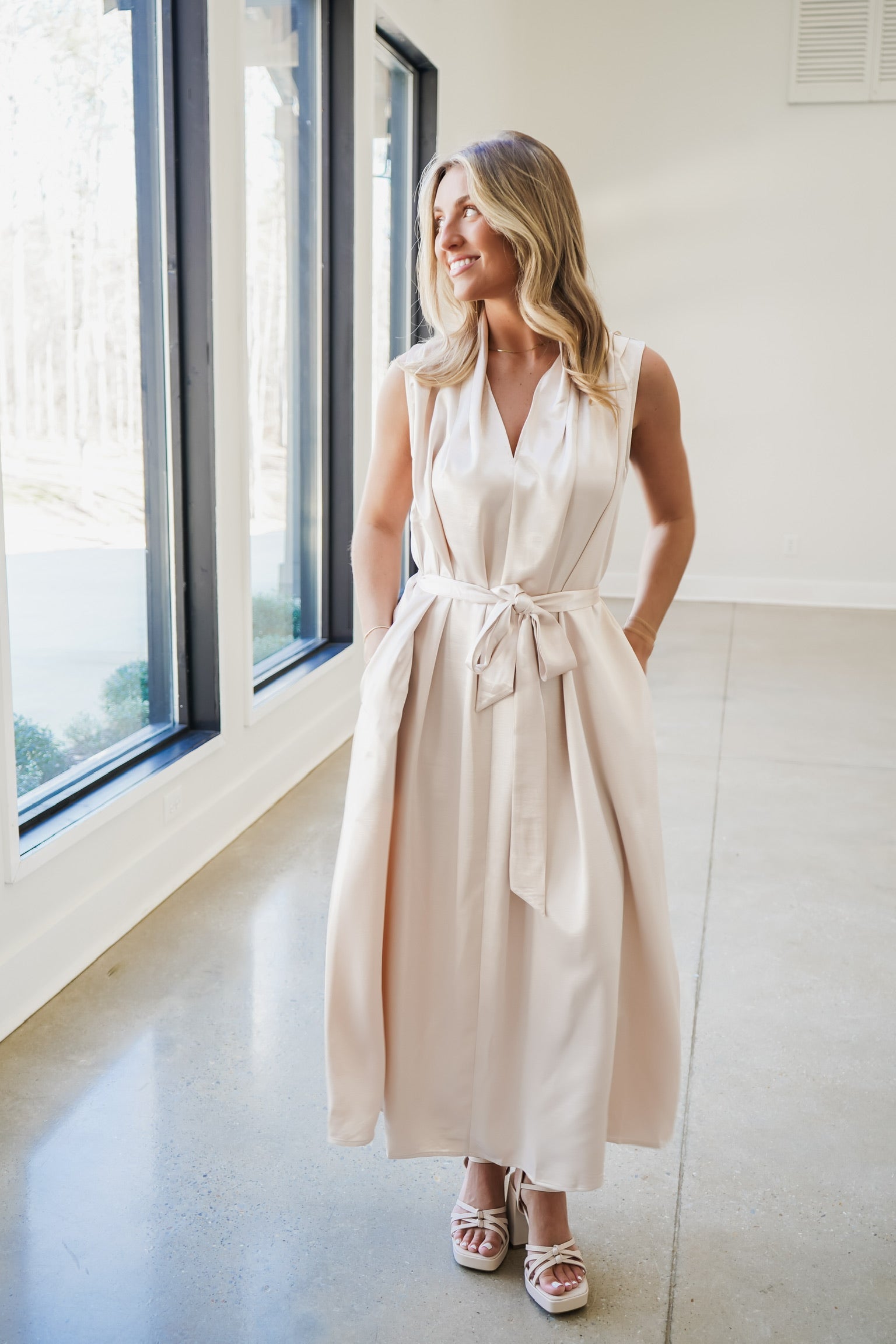 Elevate your wardrobe with the Adair Midi Dress, a sophisticated piece that effortlessly transitions from day to evening. This sleeveless design features a flattering v-neckline and a cinched waist with a graceful tie sash belt that lets you customize your silhouette. Crafted from luxurious shiny satin, the fabric catches light beautifully for an undeniably elegant look. Practical side pockets add everyday functionality without compromising style. Perfect for special occasions or when you want to feel polished and put-together!