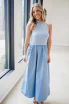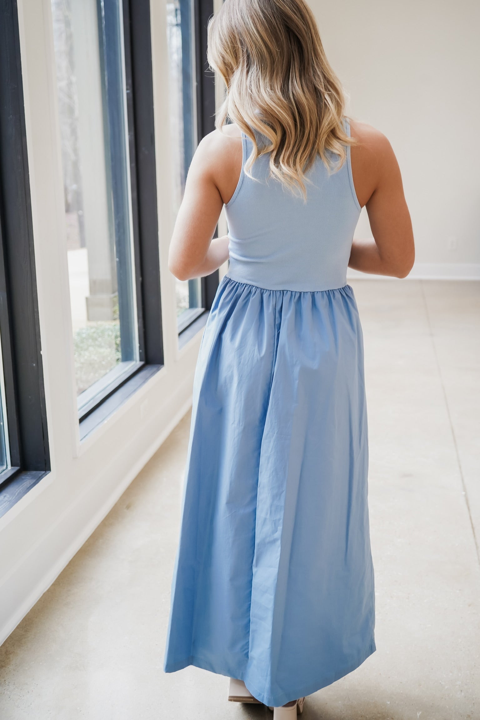 The Alison Maxi Dress combines understated elegance with thoughtful design details. This sleeveless style features a ribbed mock neck bodice crafted from soft cotton poplin, paired with a flowing maxi skirt in a serene baby blue. A subtle racerback silhouette provides gentle support, while mixed media accents add visual interest. Practical side pockets complete the piece, making it equally suited for casual wear or refined occasions.