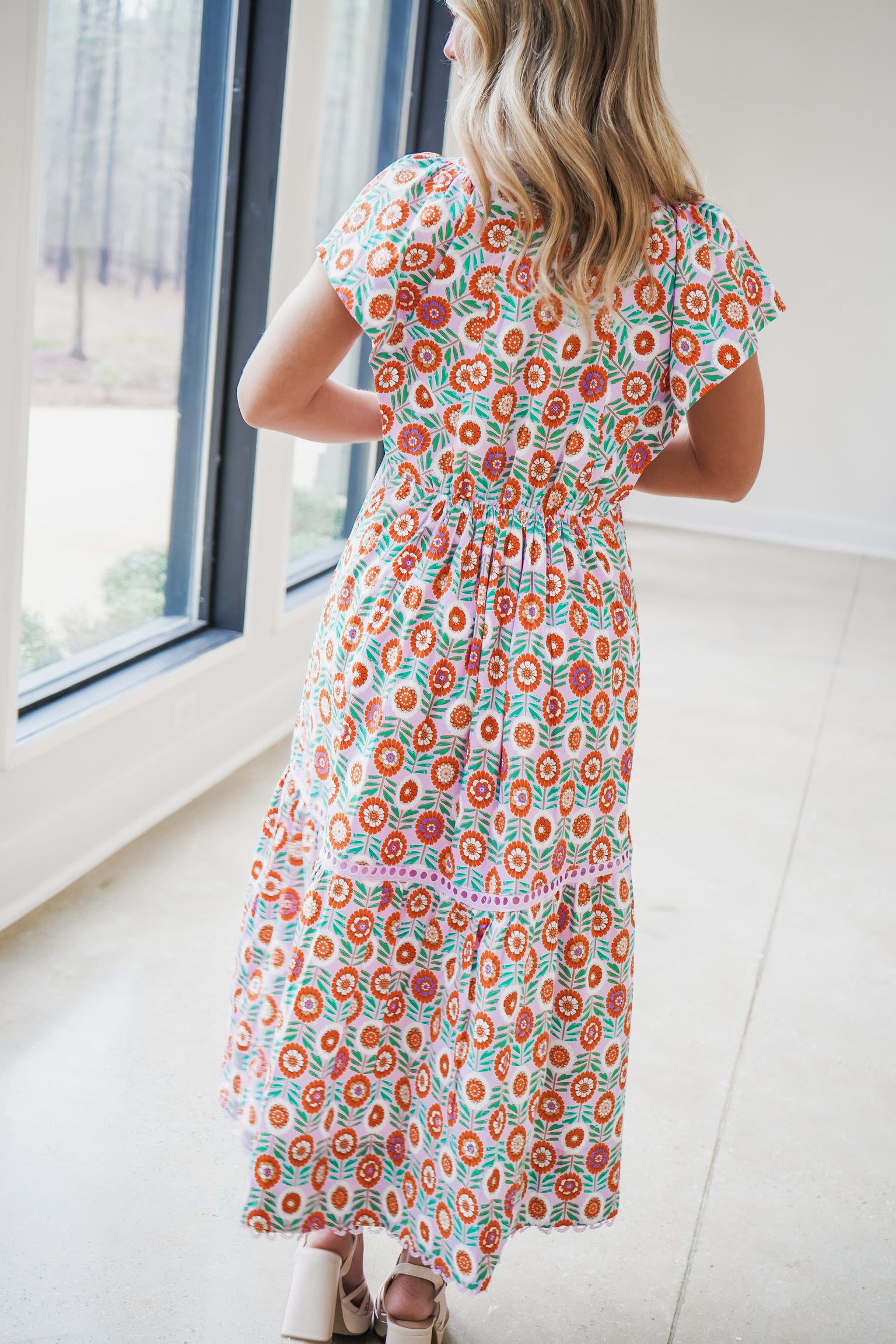 The Ani Maxi Dress combines effortless elegance with thoughtful design details. This floor-length silhouette features a flattering V-neckline and cap sleeves for refined sophistication. The vibrant orange and purple floral print brings visual interest, while delicate eyelet embroidered crochet trim along the hem adds texture and dimension. Large lavender buttons create a striking front closure that complements the dress's color palette. Perfect for warm-weather occasions, this piece balances comfort with polished style.