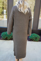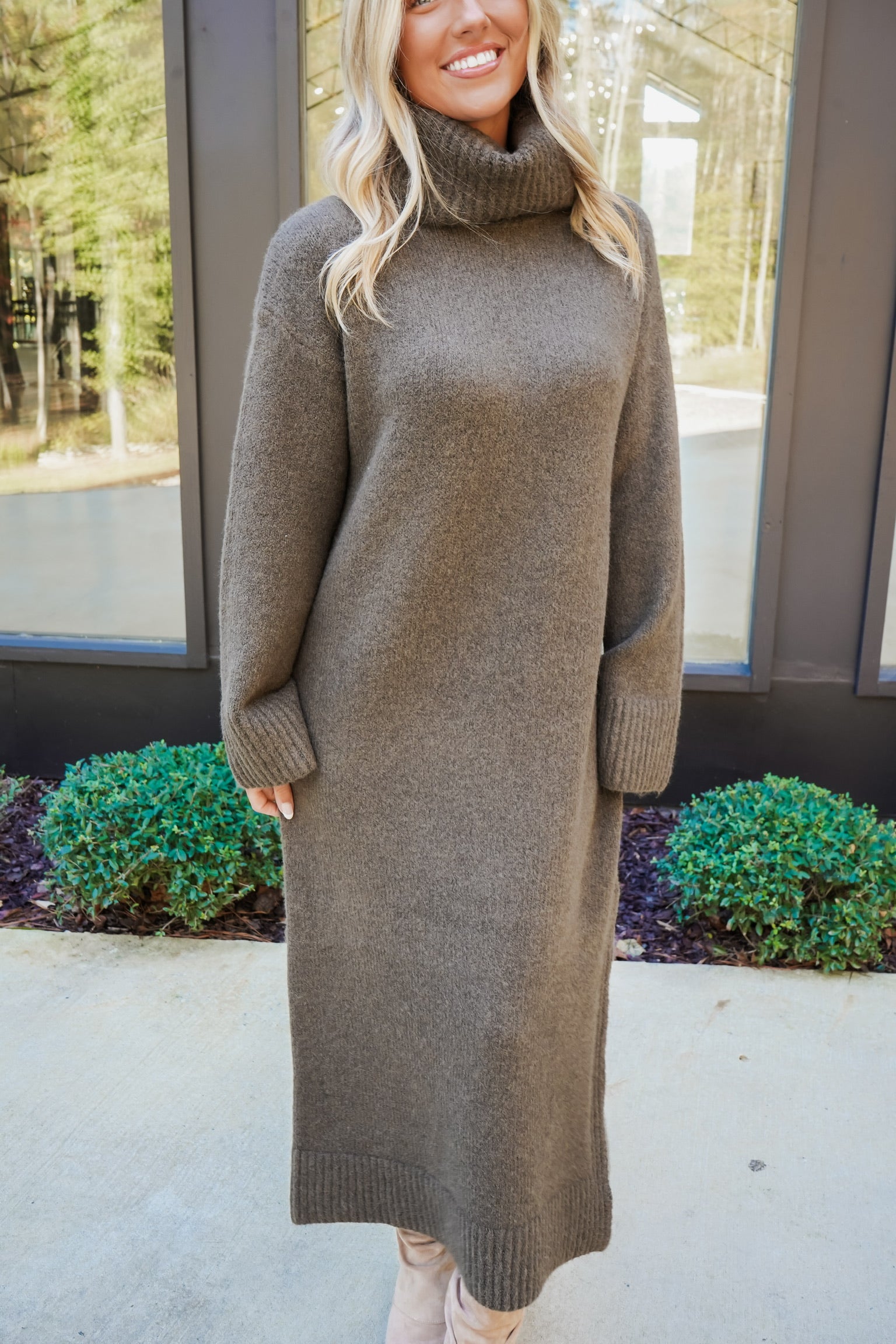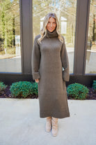 Wrap yourself in cozy elegance with this oversized cowl-neck sweater dress. Featuring a dramatic turtleneck collar, extra-wide sleeves with dropped shoulders, and a relaxed silhouette that skims to the calf, it's the ultimate comfort piece. Ribbed knit details at the collar, cuffs, and hem add polished structure, while a subtle side slit keeps things interesting. Perfect for layering or wearing solo, this felted knit dress transitions effortlessly from casual weekends to dressed-up evenings.