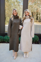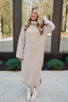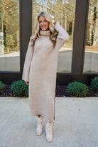 Wrap yourself in cozy elegance with this oversized cowl-neck sweater dress. Featuring a dramatic turtleneck collar, extra-wide sleeves with dropped shoulders, and a relaxed silhouette that skims to the calf, it's the ultimate comfort piece. Ribbed knit details at the collar, cuffs, and hem add polished structure, while a subtle side slit keeps things interesting. Perfect for layering or wearing solo, this felted knit dress transitions effortlessly from casual weekends to dressed-up evenings.