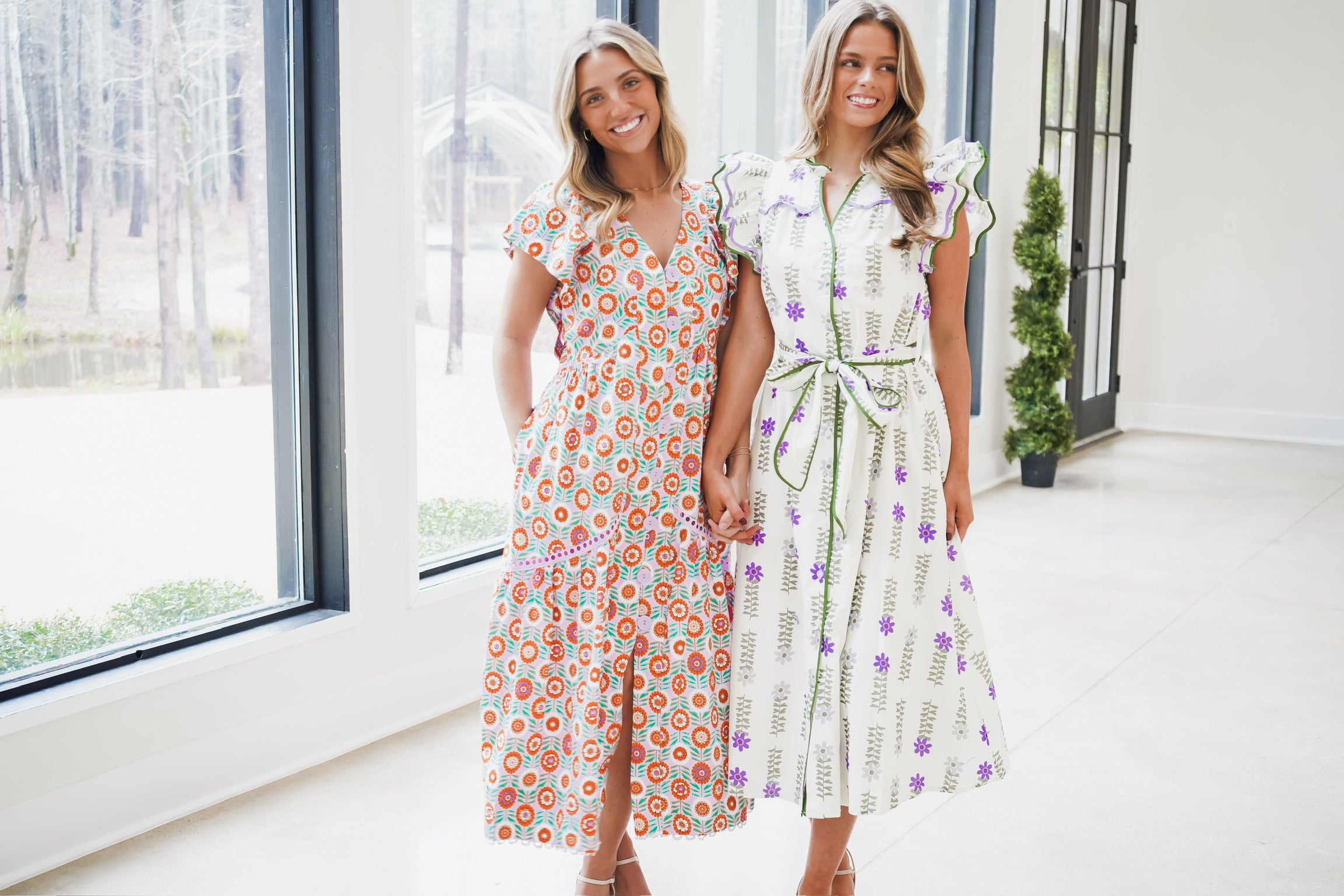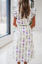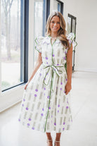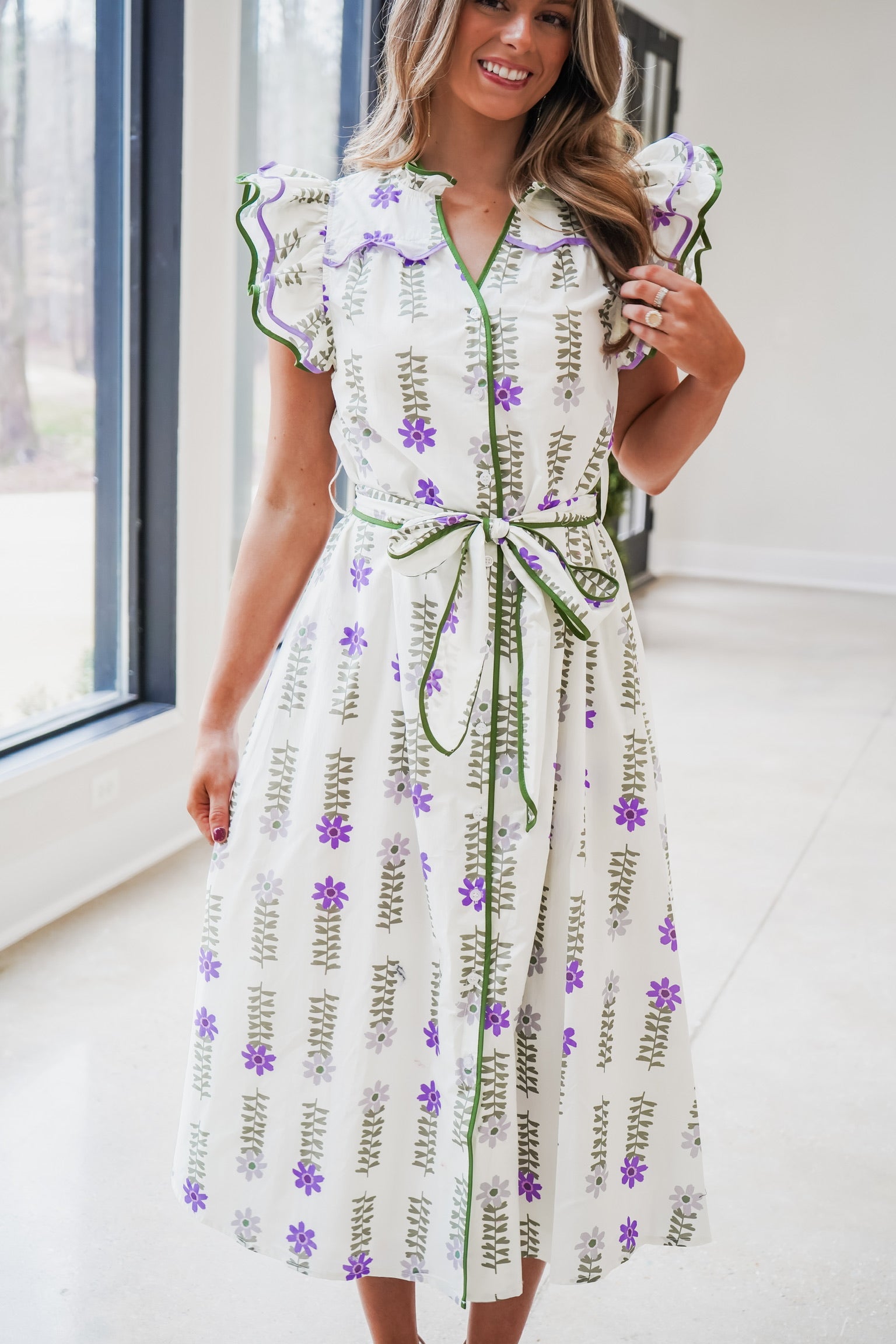 The Cady Midi Dress combines timeless elegance with contemporary flair. This white midi silhouette features a flattering v-neckline and is adorned with a lush green and purple floral vine print that adds botanical sophistication. Ruffled sleeve trim in coordinating green and purple creates dimension and movement, while an adjustable waist tie belt defines your silhouette and allows for versatile styling. Perfect for elevated casual occasions or refined daytime events, this dress balances classic proportions with modern design details.