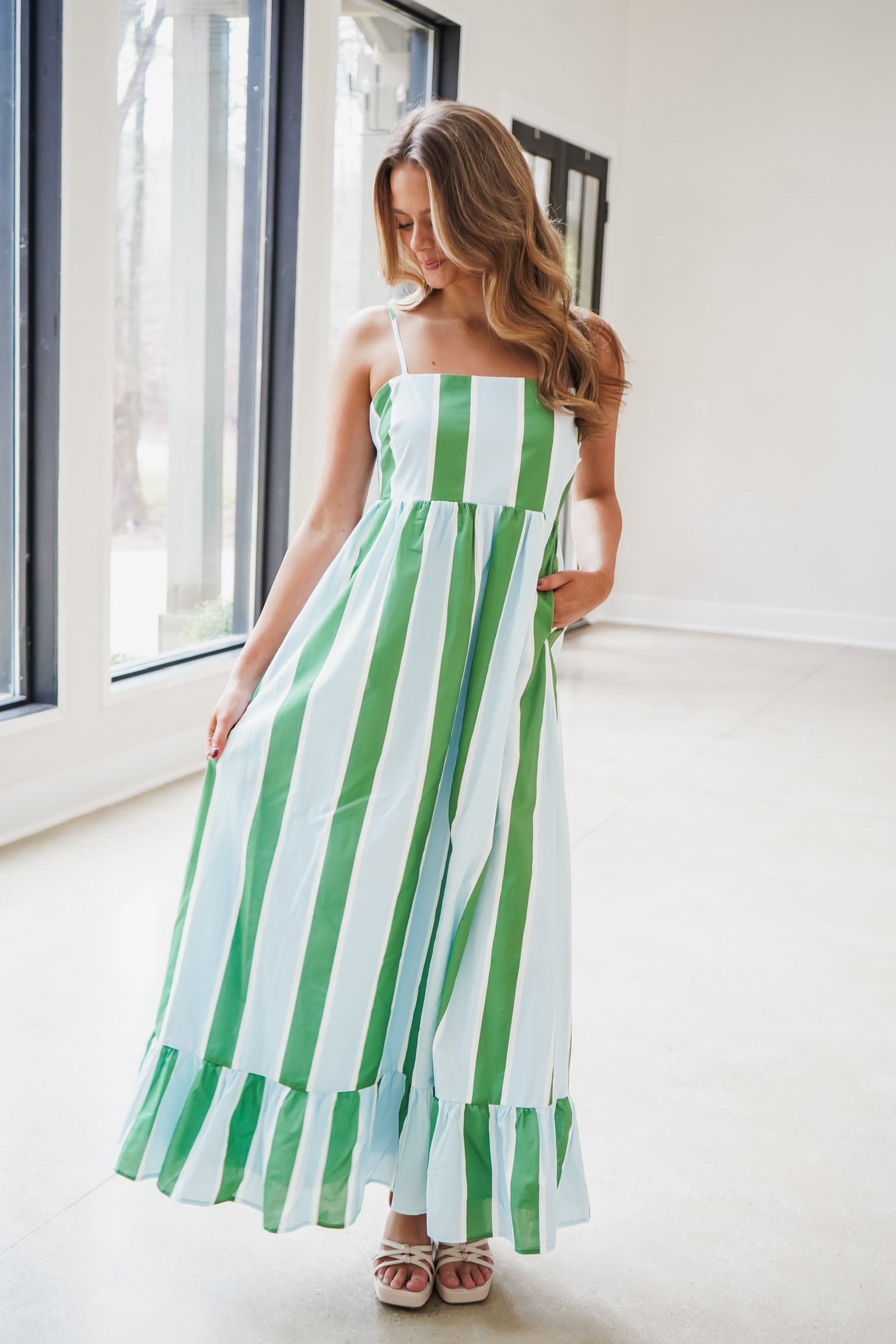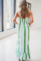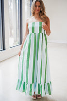 Embrace effortless elegance with the Caro Midi Dress! The stunning green and blue vertical stripes create a fresh, vibrant look, while the flattering square neckline and adjustable shoulder straps ensure a perfect fit. The playful ruffle hem adds a touch of whimsy, making it ideal for any occasion. Feel confident and beautiful!