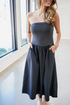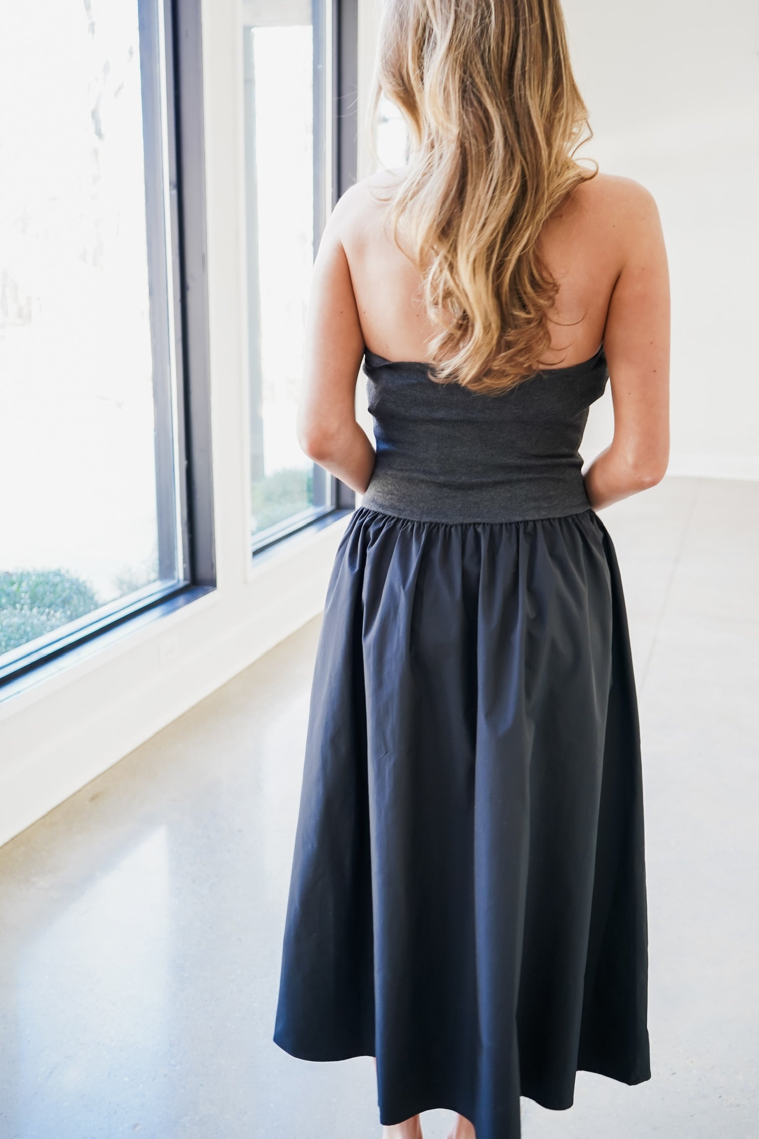 Effortless elegance meets modern versatility in the Cher Midi Dress! This strapless, sleeveless design features a soft jersey knit bodice paired with a structured poplin skirt for the perfect balance of comfort and polish. The striking two-tone mixed media detail adds visual interest, while hidden pockets deliver practical style. Dress it up for evening events or down for sophisticated daytime wear—this timeless piece transitions seamlessly through your wardrobe.