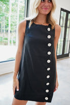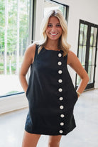 Turn heads in the Cora Mini Dress, a playful black sleeveless shift that’s perfect for any occasion. Featuring charming scallop edges and a woven button front detail, this dress adds a flirty touch to your look. Easy to wear and effortlessly stylish, it’s your new go-to for day or night fun!