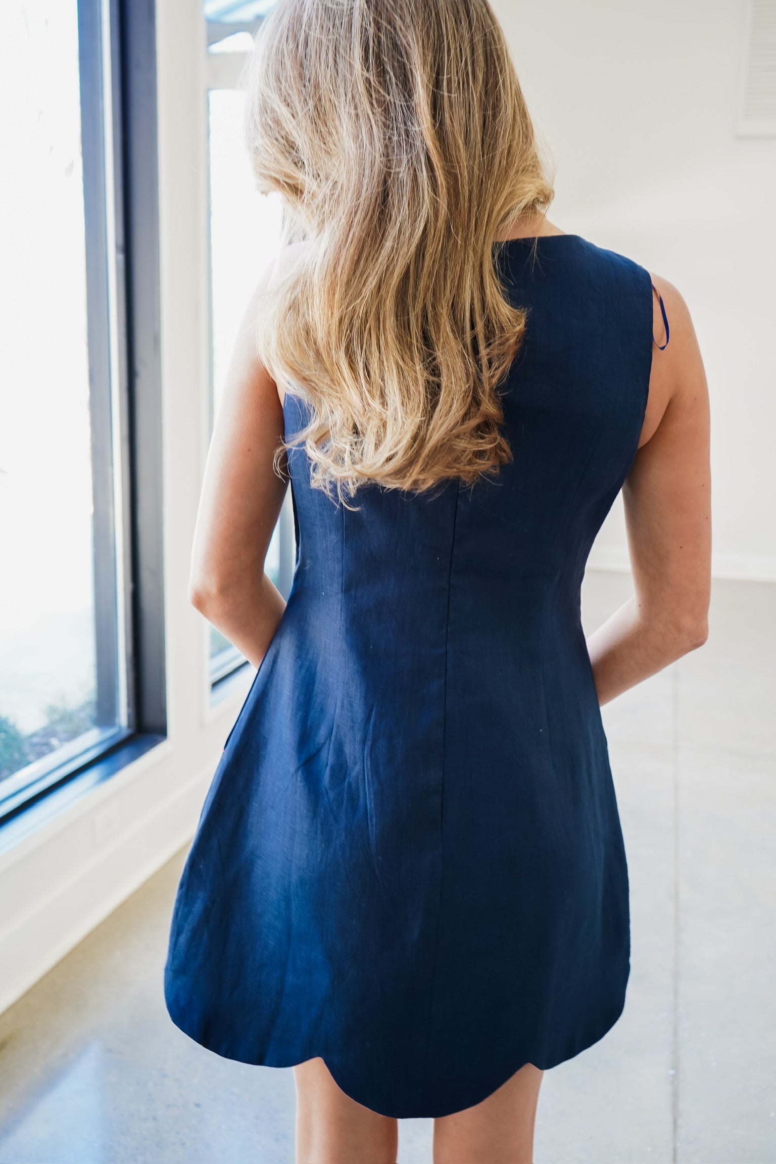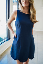 Effortless elegance meets everyday comfort in this linen shift mini dress. The lightweight fabric drapes beautifully while the sleeveless silhouette keeps you cool and chic. A charming scallop hem adds feminine detail, while the discreet back zipper ensures a perfect fit every time. Versatile navy blue hue transitions seamlessly from day to night—dress it up with heels or keep it casual with sneakers. Pure sophistication, simplified.