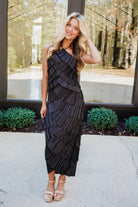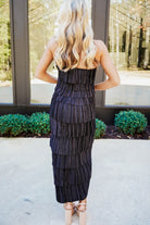 Turn heads in the Dia Midi Dress, where dramatic flair meets effortless elegance. This sleeveless halter beauty features an accordion-pleated ruffle design that creates stunning dimension through layered textures, all sculpted into a flattering diamond silhouette. The open back with adjustable neck tie closure adds an unexpected touch of allure and freedom of movement. Perfect for making a statement at any occasion—whether you're dancing the night away or commanding attention at a special event!