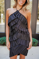Turn heads in the Dia Mini Dress, where dramatic flair meets effortless elegance. This sleeveless halter beauty features an accordion-pleated ruffle design that creates stunning dimension through layered textures, all sculpted into a flattering diamond silhouette. The open back with adjustable neck tie closure adds an unexpected touch of allure and freedom of movement. Perfect for making a statement at any occasion—whether you're dancing the night away or commanding attention at a special event!