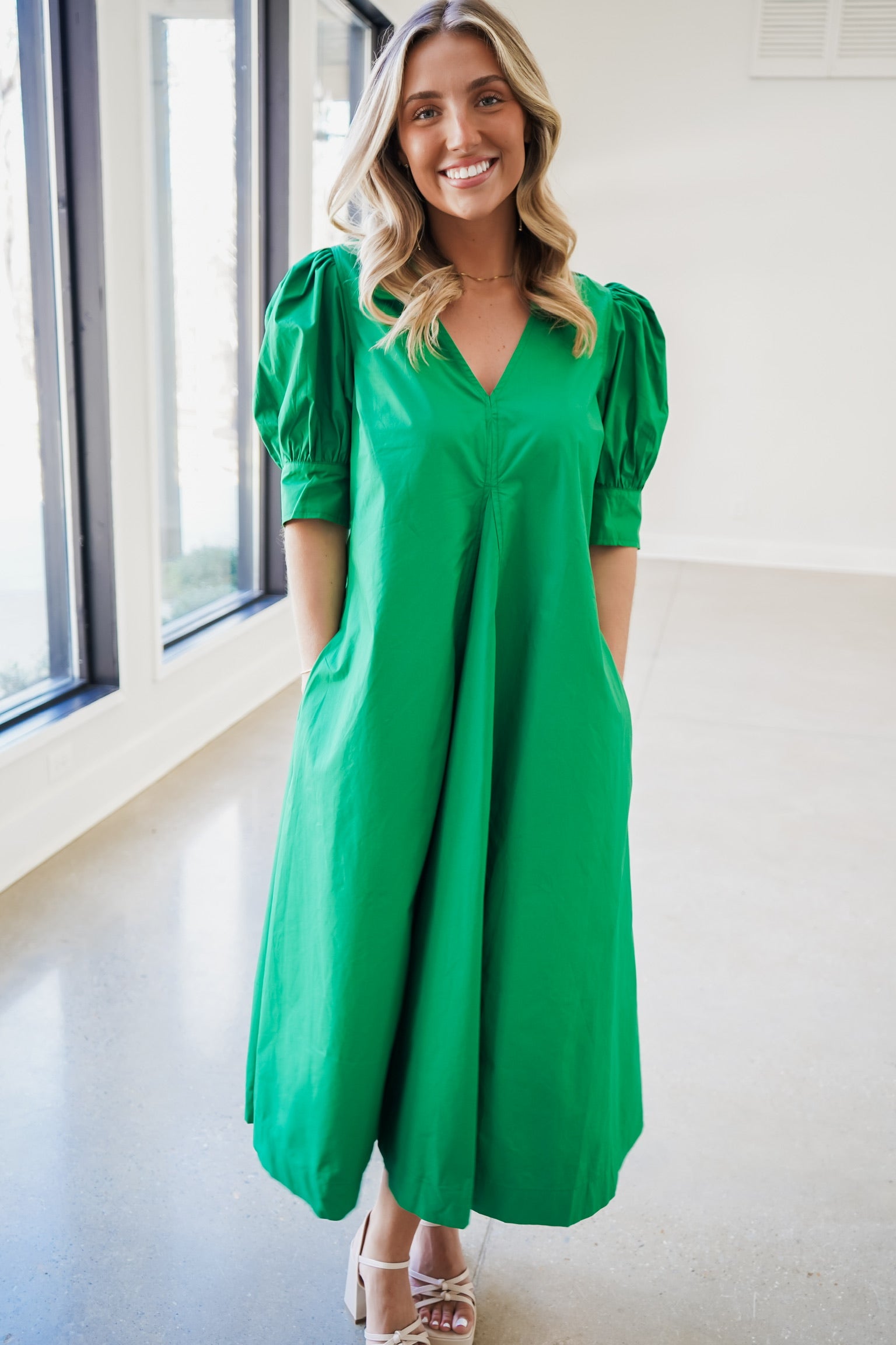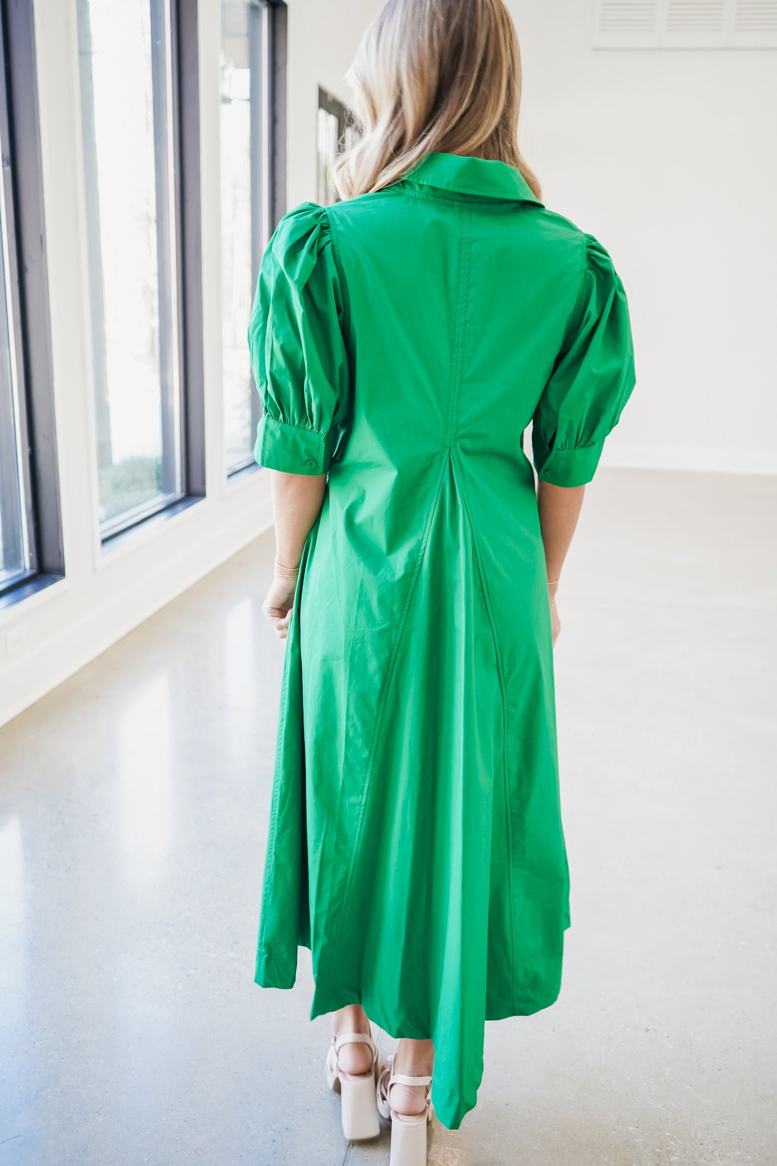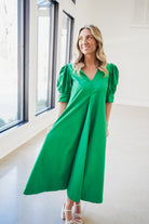 Elevate your everyday wardrobe with this sophisticated midi dress, crafted from crisp solid poplin fabric. The refined silhouette features a flattering v-neckline with a structured collar, while cuffed puff short sleeves add a contemporary touch. Perfect for transitional seasons, this versatile piece transitions seamlessly from office to weekend gatherings. The midi length provides elegant coverage while maintaining a modern aesthetic. An essential investment for those seeking polished, timeless style.