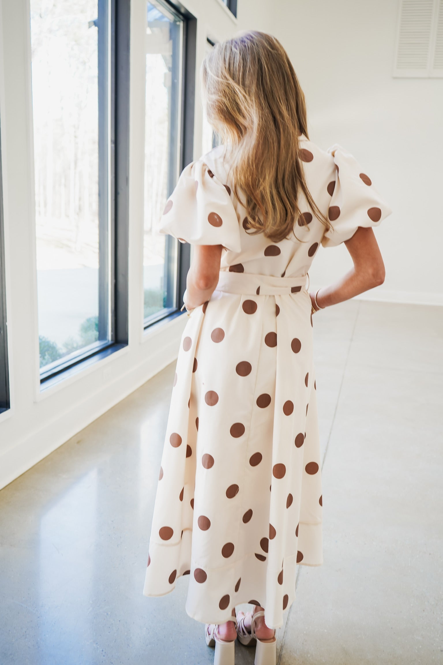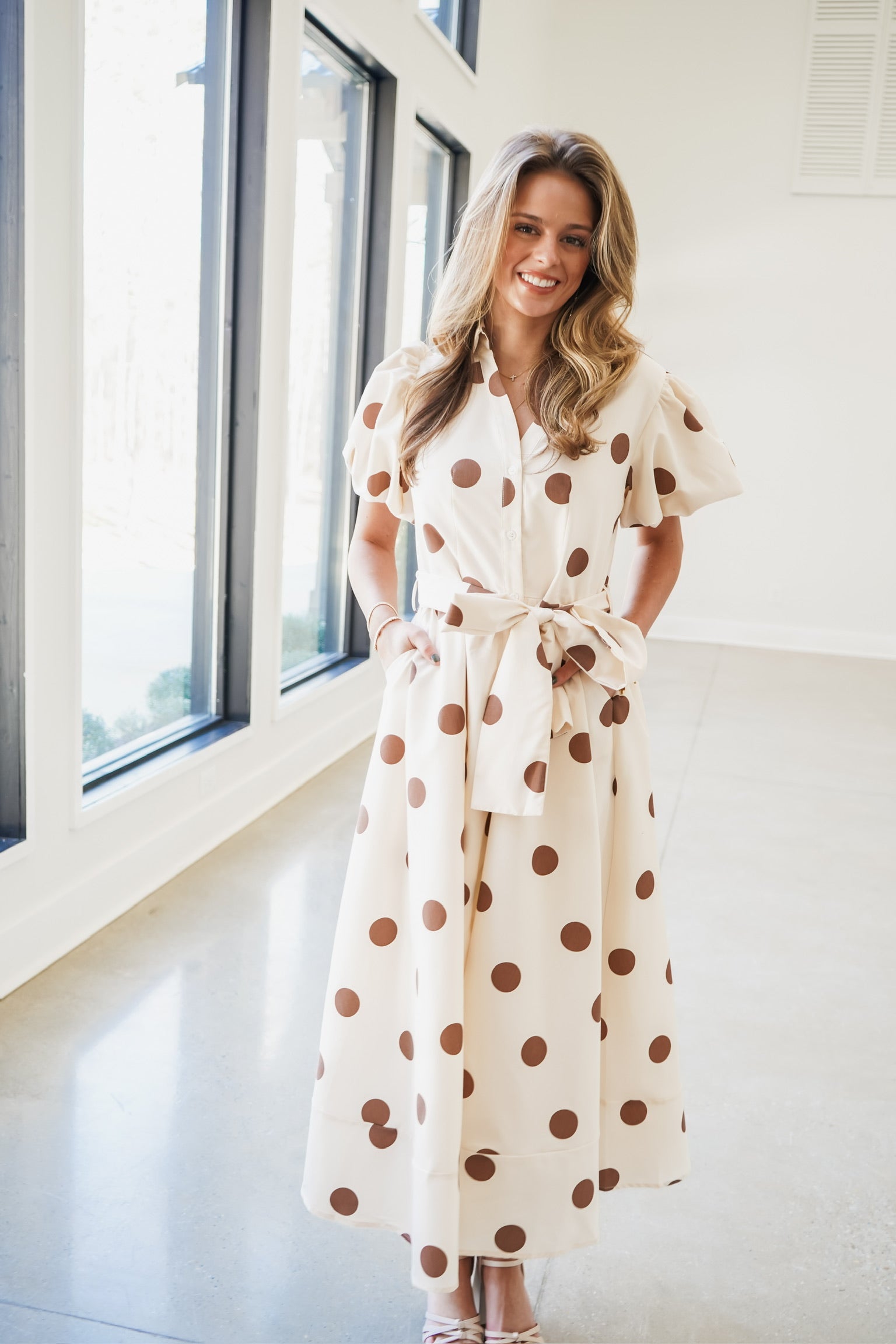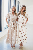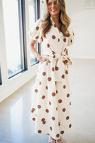 The Ember Midi Dress combines timeless elegance with playful details. This style features a collared v-neckline and puffed short sleeves for a refined silhouette, while a front button closure and side pockets deliver practical sophistication. The standout large bow waist tie sash cinches the midi length beautifully, and the contrast polka dot print adds visual interest and dimension to this versatile piece!