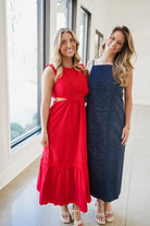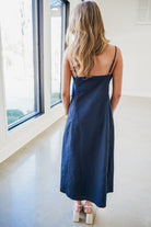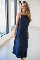 The Eva Midi Dress combines timeless elegance with modern edge. This navy blue sleeveless design features a striking square neckline and delicate embroidered pattern that draws the eye. Adjustable thin straps ensure a customized fit, while strategic cutout details add contemporary flair. The flattering A-line hem skims gracefully to midi length, creating movement and dimension. Perfect for elevated casual outings or dressed-up occasions, this piece transitions effortlessly from day to night. The sophisticated color and refined details make it a versatile wardrobe essential that works beautifully on its own or layered with your favorite jacket.