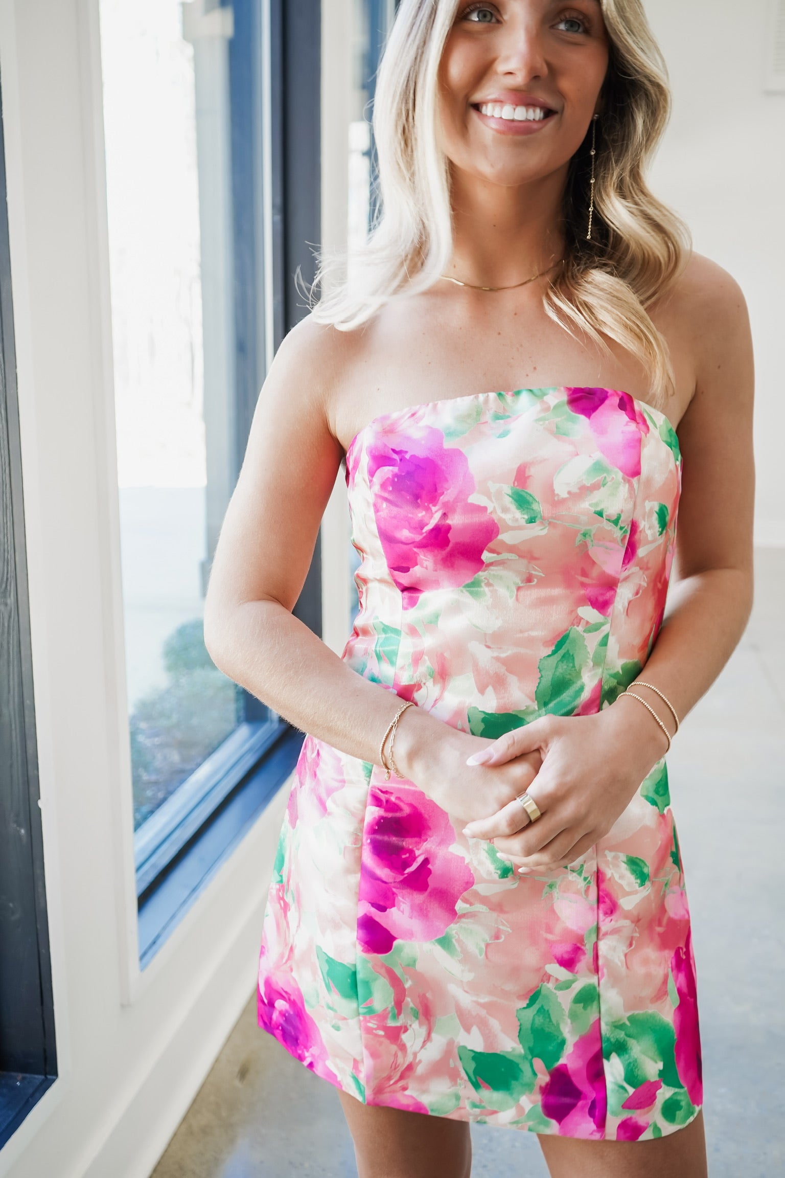 Elevate your evening look with the Freya Mini Dress, a stunning strapless tube silhouette that commands attention. Crafted from luxurious shiny satin, this piece features a captivating pink, peach, and green floral print that brings effortless sophistication to any occasion. The sleek back zipper ensures a seamless fit, while the mini length offers a modern, flattering cut. Perfect for date nights, cocktail events, or when you want to feel absolutely radiant—this dress is your go-to for turning heads and feeling confident.