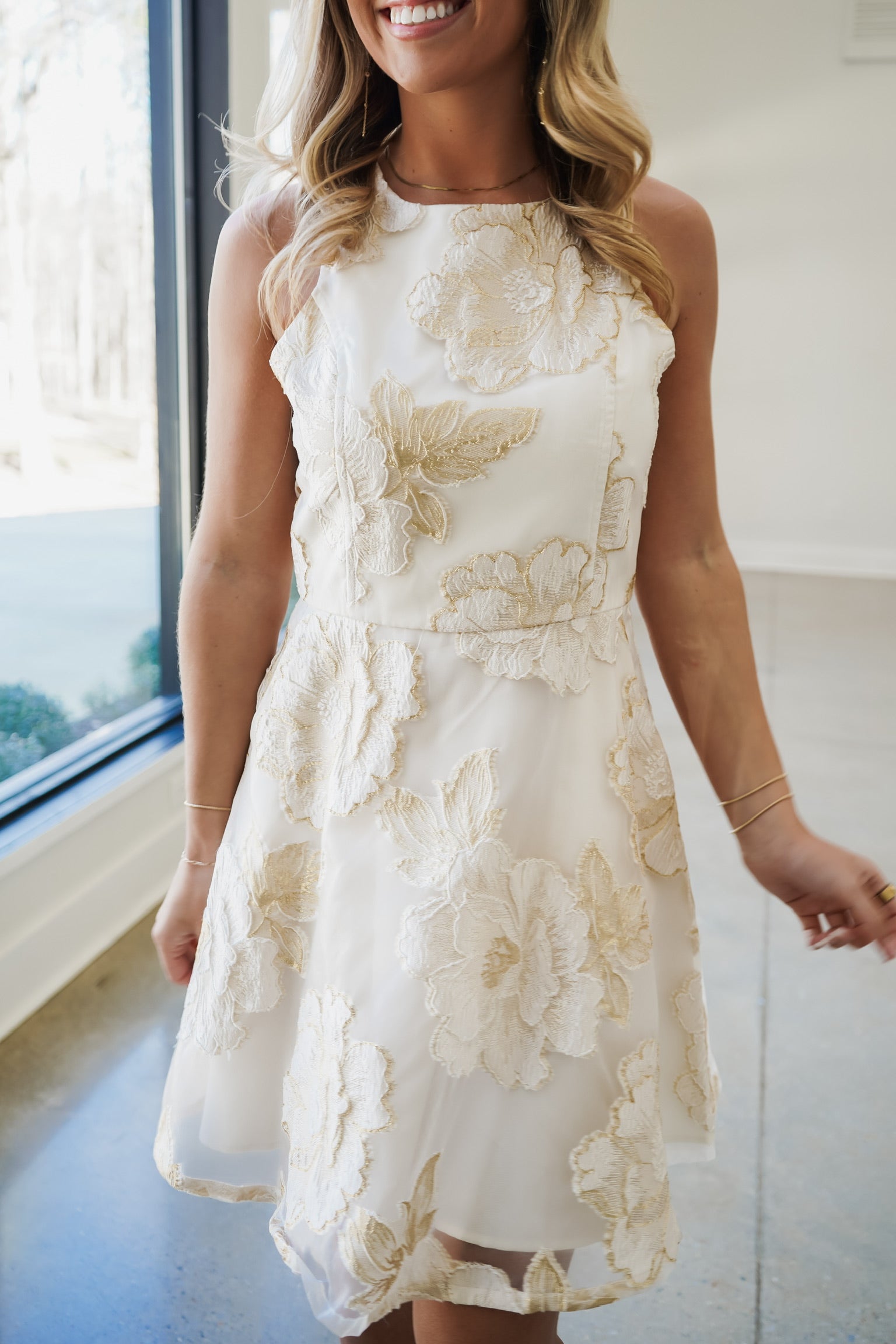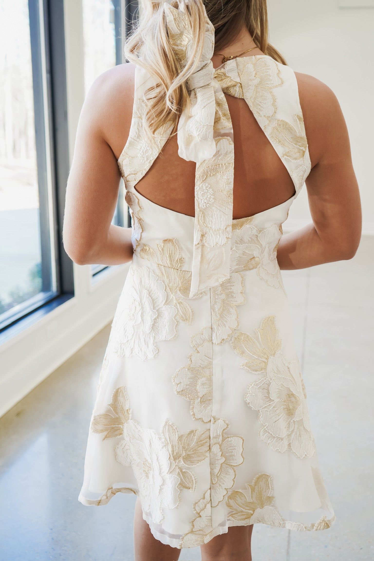 The Heather Mini Dress combines timeless elegance with contemporary design. This sleeveless silhouette features a luxurious gold and off-white palette, elevated by an intricate floral jacquard overlay that adds visual depth and sophistication. The double-lined construction ensures a refined drape and comfortable wear. An open back with a delicate bow tie detail creates an alluring focal point, perfect for making a statement at evening events or special occasions. Versatile enough for cocktail parties or upscale gatherings, this piece delivers polished style with understated glamour.